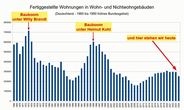 | Archiv | Impressum 20. Februar 2026, von Michael Schöfer Einen neuen Bauboom entfachen Es ist kaum zu glauben, aber die sozialliberale Koalition unter Willy Brandt (SPD) hat trotz des Ölschocks zu Beginn der siebziger Jahre (Ältere erinnern sich gewiss noch an die Sonntagsfahrverbote) einen Bauboom entfacht. 1973 wurden in den alten Bundesländern 714.226 Wohnungen gebaut, heute liegen wir im viel größeren Deutschland gerade einmal bei 251.937 (2024). Und obwohl Helmut Kohl (CDU) zum 1. Januar 1990 das Wohnungsgemeinnützigkeitsgesetz abschaffte, die gemeinnützigen Wohnungsbauunternehmen verloren dadurch ihre Steuerprivilegien (wie sich später herausstellte eine Riesendummheit), erlebte Deutschland Mitte der neunziger Jahre einen einheitsbedingten Bauboom. 602.757 fertiggestellte Wohnungen in Ost und West (1995) waren eine Größenordnung, von der alle späteren Regierungen nicht einmal zu träumen wagten. Unfassbar: In Berlin, heute ein Hotspot explodierender Wohnungs- und Mietpreise, bekam man kurz nach der Einheit Eigentumswohnungen buchstäblich für'n Appel und 'n Ei nachgeworfen. Es gab ein großes Überangebot an Wohnraum. In der Bundeshauptstadt wurden Plattenbauten sogar abgerissen und die Wohnungsbauförderung etliche Jahre komplett eingestellt. Inzwischen ein unverzeihlicher Frevel. ![]() In Deutschland hielten die Politiker zu Beginn des 21. Jahrhunderts das Wohnungsproblem für gelöst, aufgrund des demographischen Wandels prognostizierten sie einen Bevölkerungsrückgang, den Prognosen zufolge sollte die Zahl der Haushalte und damit die Nachfrage nach Wohnungen ab 2020 sinken. Falsch gedacht: Deutschland hatte im Jahr 2000 insgesamt 82,3 Mio. Einwohner, Ende des dritten Quartals 2025 waren es 83,5 Mio. "Prognosen sind schwierig, besonders wenn sie die Zukunft betreffen." Dieses Bonmot wird u.a. Karl Valentin, Mark Twain, Kurt Tucholsky, Winston Churchill oder Niels Bohr zugeschrieben. Wer es gesagt hat, ist bislang ungeklärt, inhaltlich ist es dagegen absolut richtig. Ob die Bevölkerung in Deutschland bis Mitte des Jahrhunderts überhaupt noch einmal sinkt, ist derzeit fraglich. Auf absehbare Zeit wird deshalb entgegen den damaligen Vorhersagen weiterhin hoher Wohnungsbedarf bestehen. Schlechte Aussichten für Wohnungssuchende und Immobilienkäufer. Das preisbereinigte Bruttoinlandsprodukt ist nach Angaben der Deutschen Bundesbank seit 1973 um 131 Prozent gestiegen, und wir sind volkswirtschaftlich betrachtet real fast 40 Prozent reicher als 1996. Bedauerlicherweise sind die Baukosten und die Baulandpreise noch viel stärker gestiegen. Genau hier setzte der frühere SPD-Vorsitzende Hans-Jochen Vogel an. Vogel wies zu Recht darauf hin, dass Boden, anders als andere Güter, unproduzierbar und daher keine beliebige Ware ist, aber dennoch Angebot und Nachfrage den Preis bestimmen. Aufgrund der hohen Bedeutung des Wohnens für die Menschen schlug er daher folgende Maßnahmen zur Neuordnung des Bodenrechts vor [1]: